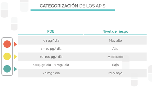 1º. El primer paso es fijar el nivel de riesgos de los APIs que se fabrican en nuestras plantas, el primer punto de esta caracterización es la de fijar la peligrosidad de los APIs que se manipulan en nuestra planta a partir de los PDEs de los APIs, una primera clasificación sería la siguiente