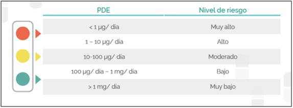 Este valor de PDE nos va dar los distintos niveles de riesgo de los principios activos que se manipulan en una instalación multiproducto.