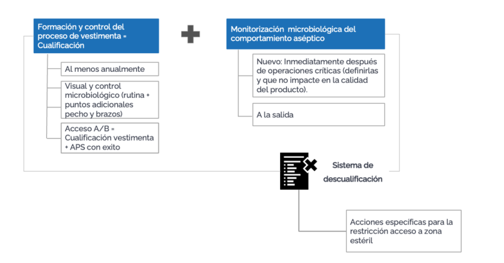 Recordemos que además de un procedimiento de cualificación del personal, debe haber un sistema de descualificación, en el que se definan los motivos de descualificación (como la participación en Aseptic Process Simulation (APS) fallido o tendencias negativas en la monitorización de personal). Para permitir que un empleado descualificado vuelva a participar en prácticas asépticas, debe haber un reentrenamiento y una recualificación. Para que pueda acceder a Grado B y realizar intervenciones en Grado A, un empleado que ha sido descualificado debe, además, participar en un APS con resultado conforme.