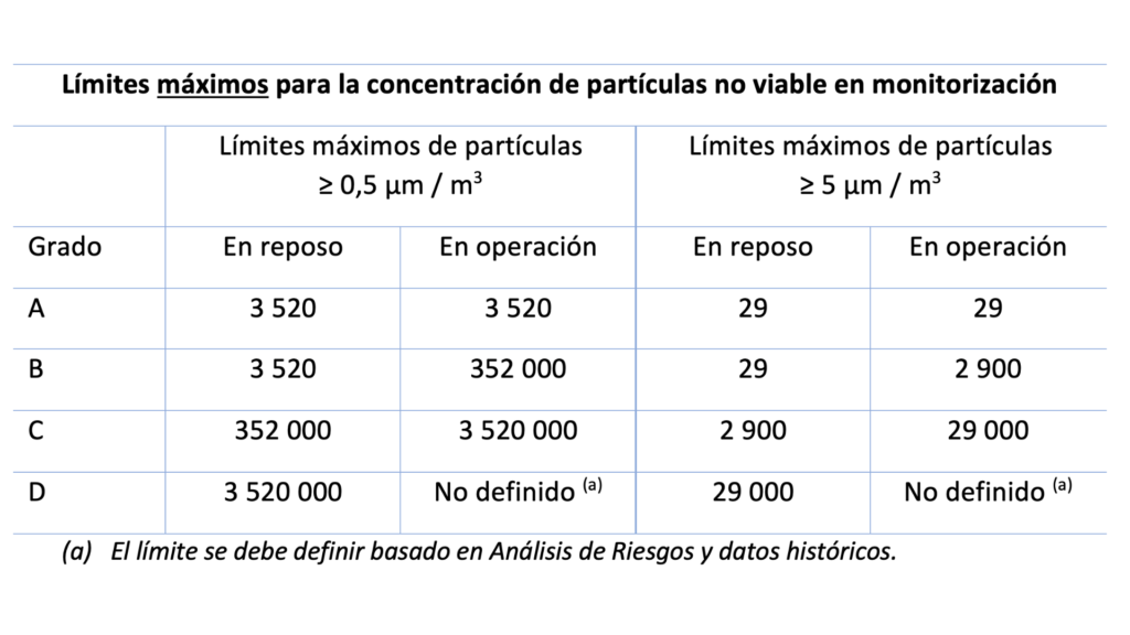 En cuanto a la monitorización de partículas no viables hay un cambio significativo relacionado con las salas Grado D, cuyo límite máximo de partículas en operación ahora se debe fijar de acuerdo a un análisis de riesgos y en datos históricos. Para todas las clases de sala, los límites de alerta se establecerán en función de un análisis de tendencias.